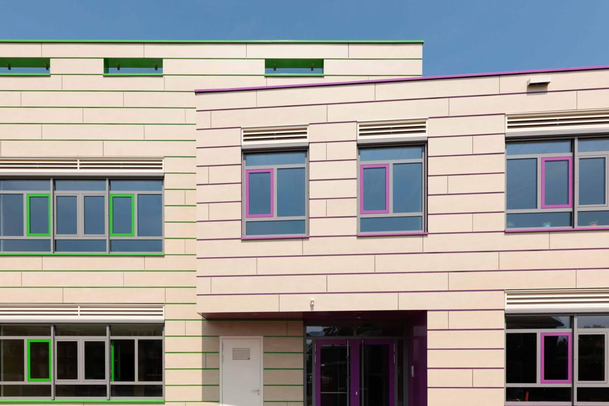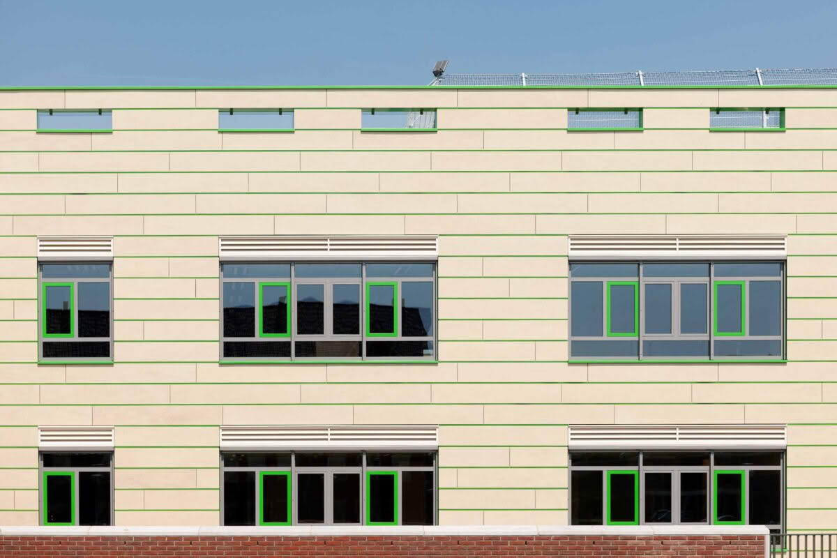 Le matériau de façade est constitué de plaques de fibres-ciment Colormat Classic (couleur : Champagne H412) de SVK collées à la structure de la façade en bandes horizontales de différentes longueurs.